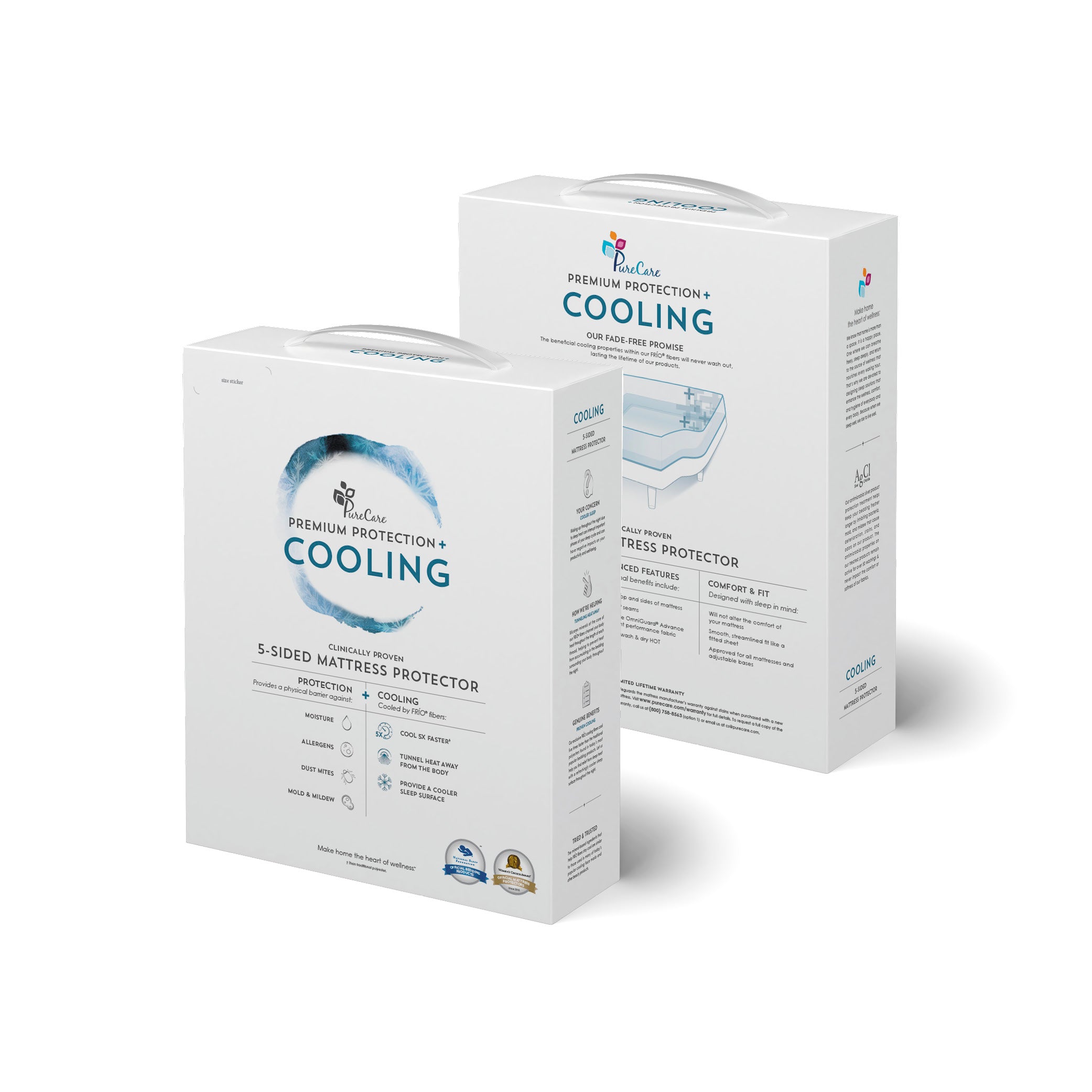 Product Disclaimer: This product is excluded from all coupons and sales featured on the website.PureCare's Cooling 5-Sided Mattress Protector combines our specially designed OmniGuard® Advance fabric with rapid chill cooling fibers€š a micarex-based responsive textile with unique cooling properties. FRíO's rapid chill cooling fibers disperse body heat throughout the surface of the protector at a rate five times faster than that of regular polyester, focusing solely on heat reduction along the sleep surface through a combination of nano-technology, nylon, and mica minerals. The unique tunneling effect of the mineral-based fiber keeps heat from accumulating in the material surrounding the body, providing a refreshingly cooler sleep surface. FRíO's rapid chill cooling fibers are a crushed mineral infused textile, meaning the cooling effects of this material are literally built into the fabric and will not wash out, lasting the lifetime of the protector.
