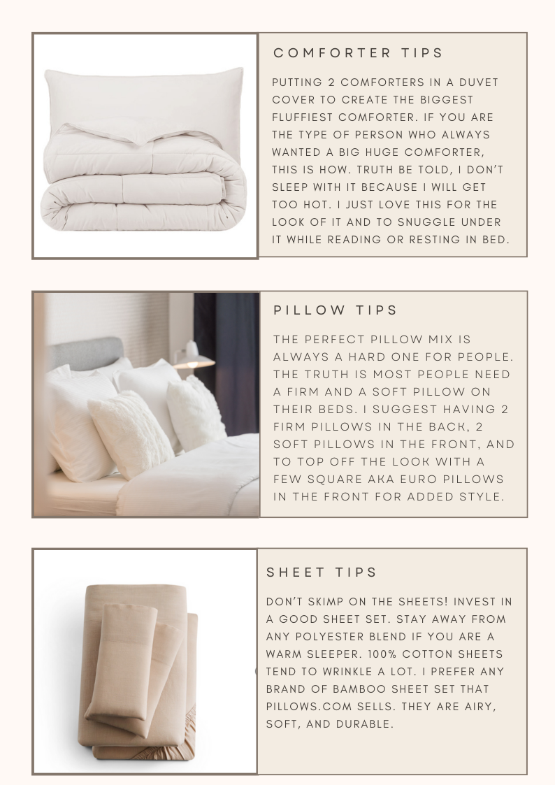I just had my 6 year anniversary of working at Pillows.com. I am lucky to say I have become a serious bedding expert in that time! Below are some of my favorite tips I have picked up in those 6 years on how to make the world's most perfect bed.