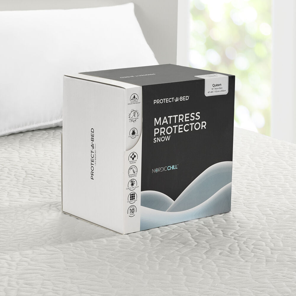 Protect-A-Bed® Snow Cooling Mattress Protector has a innovated design that not only protects your mattress but helps keep you cool and comfortable while you sleep. The Miracle Membrane is flexible, silent and thin, while providing effective top surface waterproof mattress protection. Blocks dust mites, allergens, liquids and sweat from penetrating the bed. Nordic Chill fabric dissipates heat from the body, creating a cooling effect on your skin for a restful sleep climate. Cools effectively, even through sheets. Protect the life of your mattress and sleep more comfortable on the Protect-A-Bed® Snow Cooling Mattress Protector.